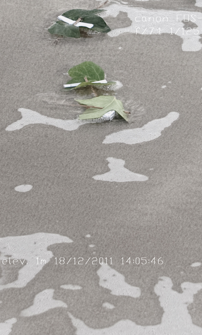 Como dispositivo complementario, a lo largo de una semana formulamos 500 deseos y los imprimimos sobre papel reciclado. La mañana del 18 de diciembre, Día Internacional del Migrante, y de forma coordinada con los actos de protesta convocados por el Movimiento de Tania Bruguera en New York, ensartamos cada uno de los deseos en una hoja de hiedra y los llevamos a la playa. Deseos que avanzaron mar adentro unos cien metros y que dejamos allí, esperando que el agua los arrastrara de vuelta hacia la costa. Horas más tarde recogimos en nuestro Cuaderno: “Recorremos la orilla con la intención de rescatar del naufragio algunos de nuestros deseos. Medimos el mar. Parecemos salidas de un libro de John Banville. Nos gustaría haber salido de una epopeya de Brecht: “en política no hay mucha alternativa, o se es sujeto o se es objeto.” De más está decir lo que el poder prefiere, cualquiera que sea la forma de poder. Muy cerca del pantalán aparecen algunos de los deseos. Desplegados, deshechos, casi ilegibles. Metáforas de roturas y discontinuidad. Los hay que permanecen aún a bordo de la hoja en la que han surcado este mar. Eternamente el mar.