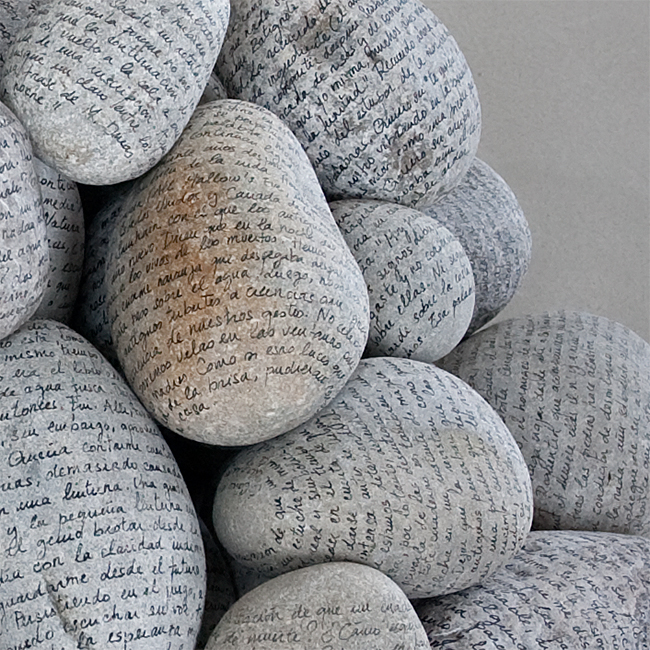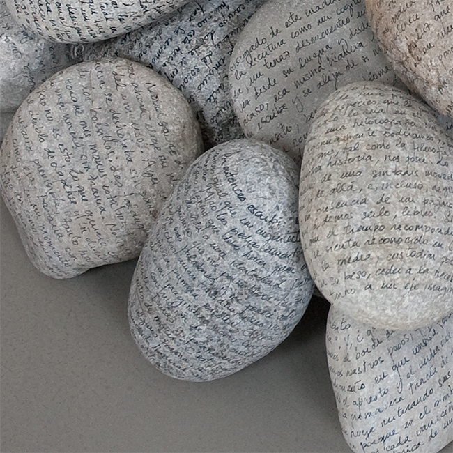 Contra el vertiginoso relevo de los textos sobre la brillante superficie de móviles y tabletas, elegimos la fijeza de la tinta sobre la quietud del mineral. Contra el centelleo de la información que (más allá de su calidad o del crédito que merezca) se replica y se desplaza incesante sobre una marabunta de píxeles, la calma meditativa de un texto único que exige del lector un ejercicio físico tanto como mental. Girar la piedra para recorrer la espiral descendente de las palabras, soportar el peso entre las manos, apreciar la textura y el color, comporta un ejercicio de atención múltiple. Nos sitúa ante una textualidad que se propone a la vez como un ejercicio intelectual y sensual.