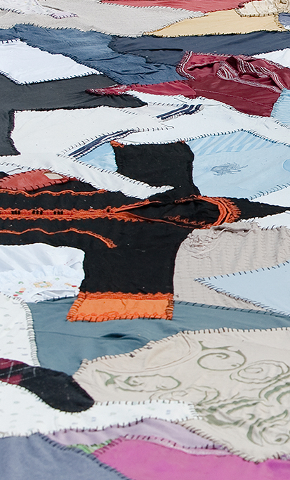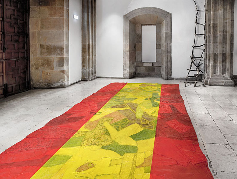 IN ITINERE es una bandera española de proporciones reglamentarias, íntegramente confeccionada a mano con ropa de inmigrantes “ilegales”. Este planteamiento conceptual supone, desde el principio, tanto una contradicción en los términos como una vindicación, ya que por el mero hecho de serlo, ningún ser humano debería ser considerado como “ilegal”. Toda bandera se concibe como un espacio identitario que representa un territorio de inclusión estrictamente regulada.